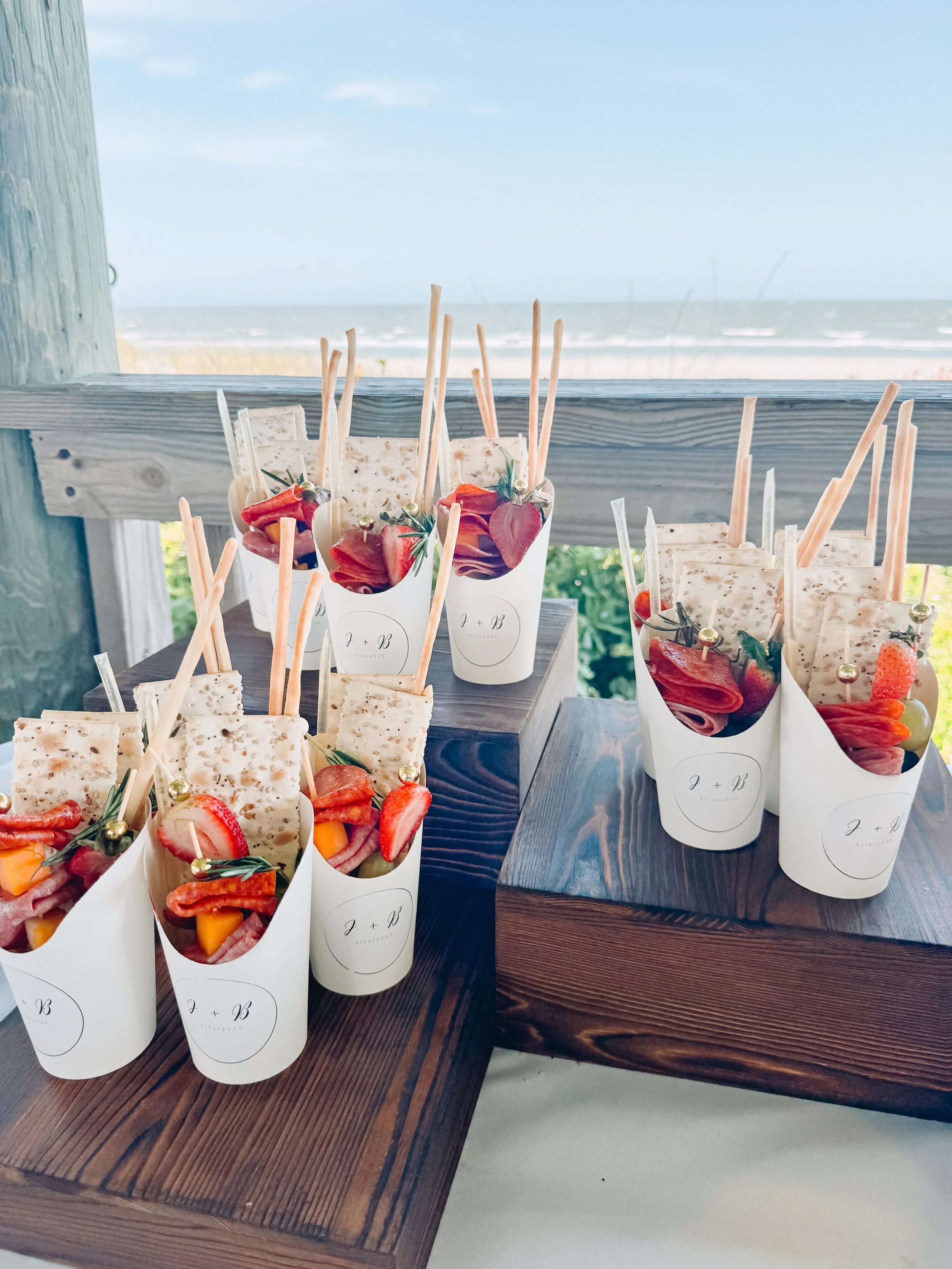 Each deluxe cup is beautifully filled with a curated selection of artisan cheeses, cured meats, fresh fruits, crunchy breadsticks, and a touch of greenery, all tucked into a chic cup personalized with the couple’s initials and wedding date (or your custom details!). They’re photo-ready and guest-approved.
